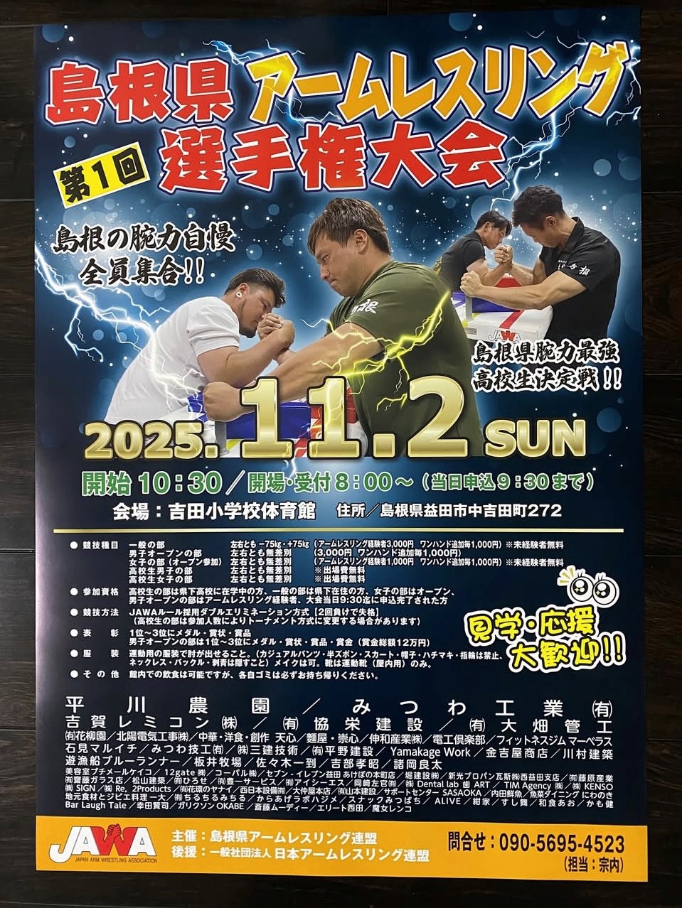 ●参加資格: 高校生の部は県下高校に在学中の方、一般の部は県内在住の、女子の部はオープン男子オープンの部はアームレスリング経験者、大会当日に申込された方