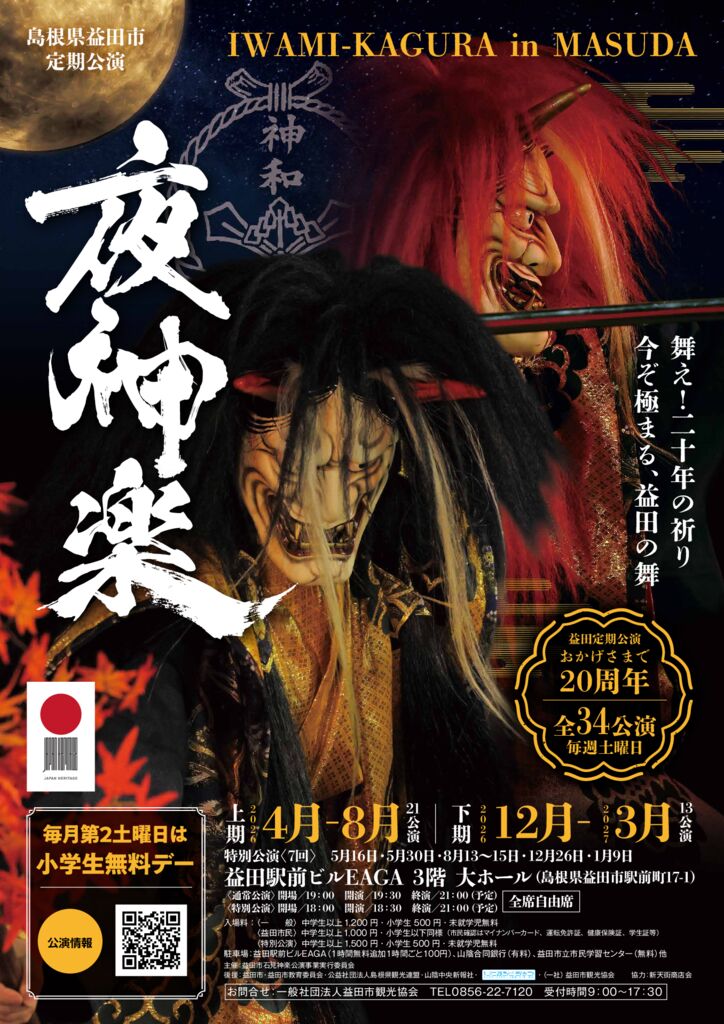 お問合せ:益田市石見神楽公演事業実行員会【事務局:一般社団法人益田市観光協会0856-22-7120 時間9:00~17:30】