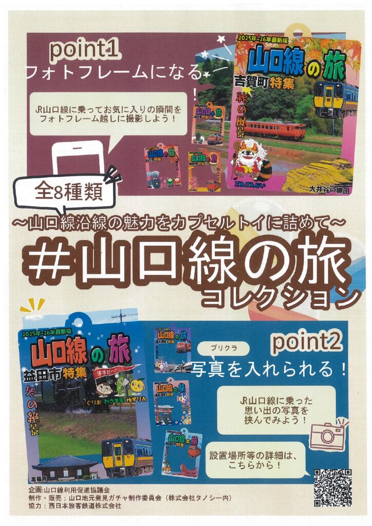 JR山口線沿線自治体である山口市、島根県津和野町、吉賀町、益田市及び商工会議所、観光団体等から組織される「山口線利用促進協議会」では、JR山口線の利用促進に向け様々な取組を展開している中で、沿線を更に盛り上げたいという思いでオリジナルカプセルトイを企画しました。