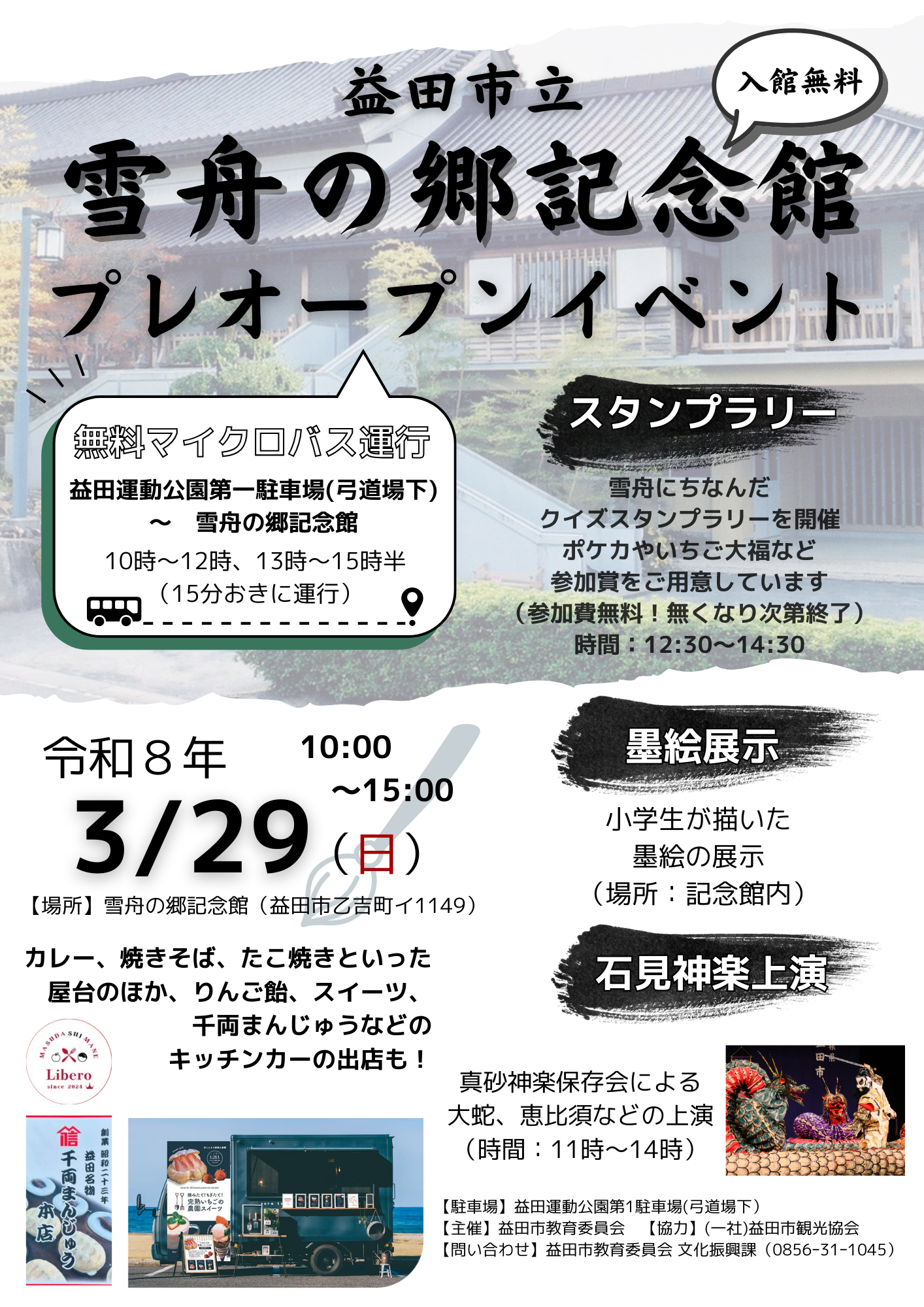 当日は小学生が書いた墨絵の展示、石見神楽上演、雪舟にちなんだクイズスタンプラリーを開催します。